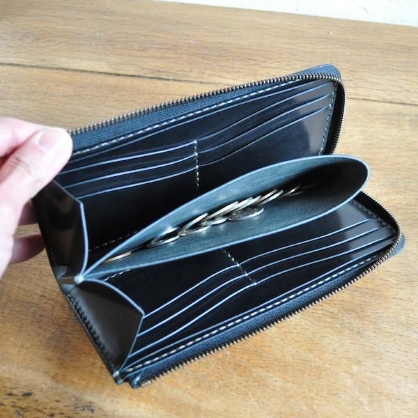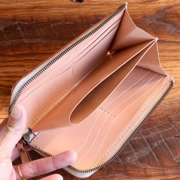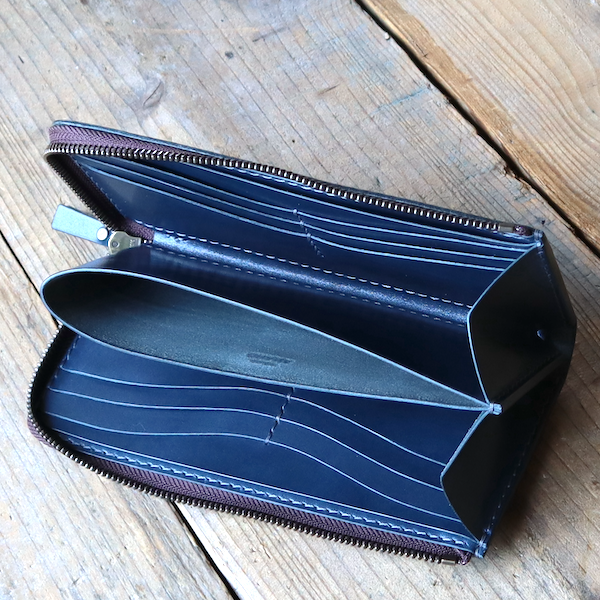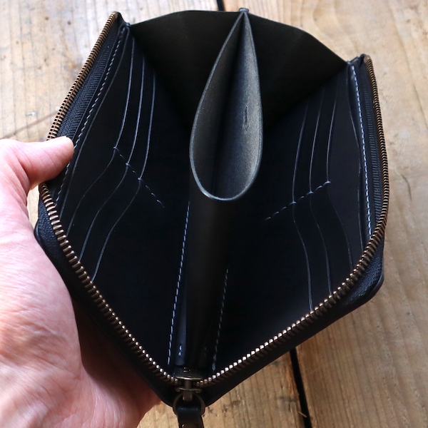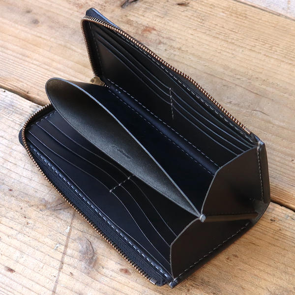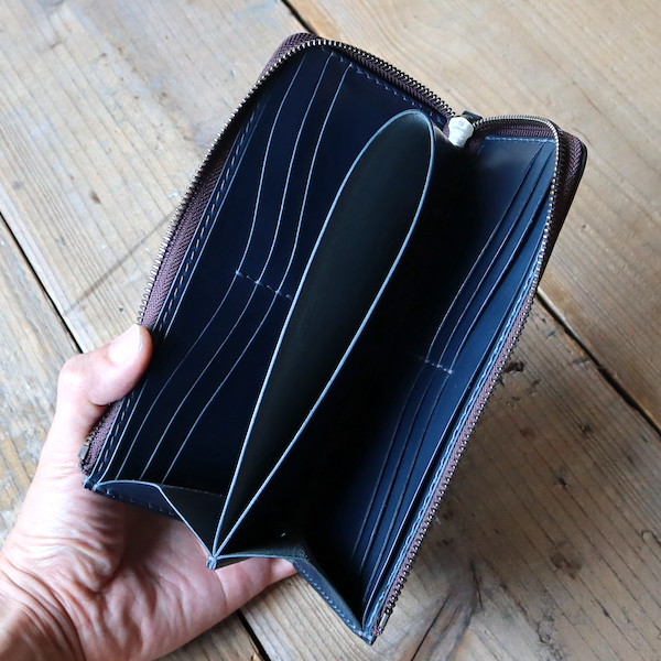 ファスナーを開くとお札、小銭、カードが全て見れる作りで、