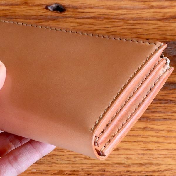 ブラジル産のミモザの樹皮から抽出されたタンニンエキスで約20日間の時間をかけて じゅうぶんになめし込みんだ栃木レザーのヌメ革にグレージング仕上げをしており、吟面がタイトで密な艶感があります。グレージング加工時の摩擦熱により吟面に独特のムラが生じます。
